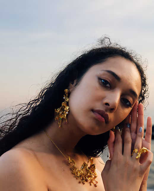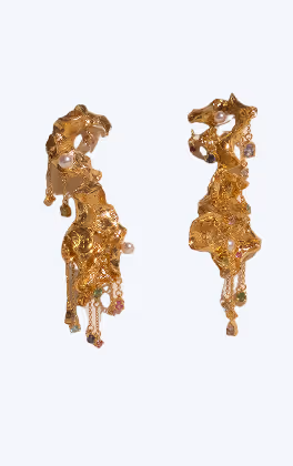 Shells, dried flowers, and wisteria are the main motifs, shaped using bespoke molds and tools to capture their unique forms. After being intricately carved in wax, they are handcrafted and plated in silver or gold, adorned with vibrant gemstones that cascade like nature’s chandelier, illuminating the delicate beauty of each piece.